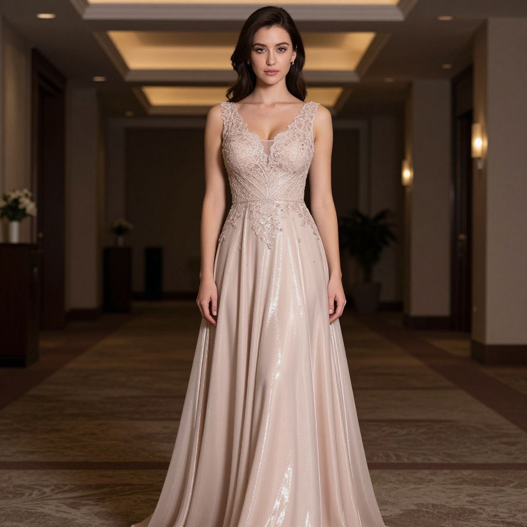 A Voluptuous woman, classic elegance, A-line evening gown in a shimmering blush tone, sleeveless, illusion neckline with lace appliqué detailing, fitted bodice with beadwork and sequins, flowing skirt with a slight train, subtle keyhole back, simple stud earrings, in a luxury hotel ballroom. Ambient light, soft shadows, natural feel Sexy. Pretty face and beаutiful eyes. Big breasts