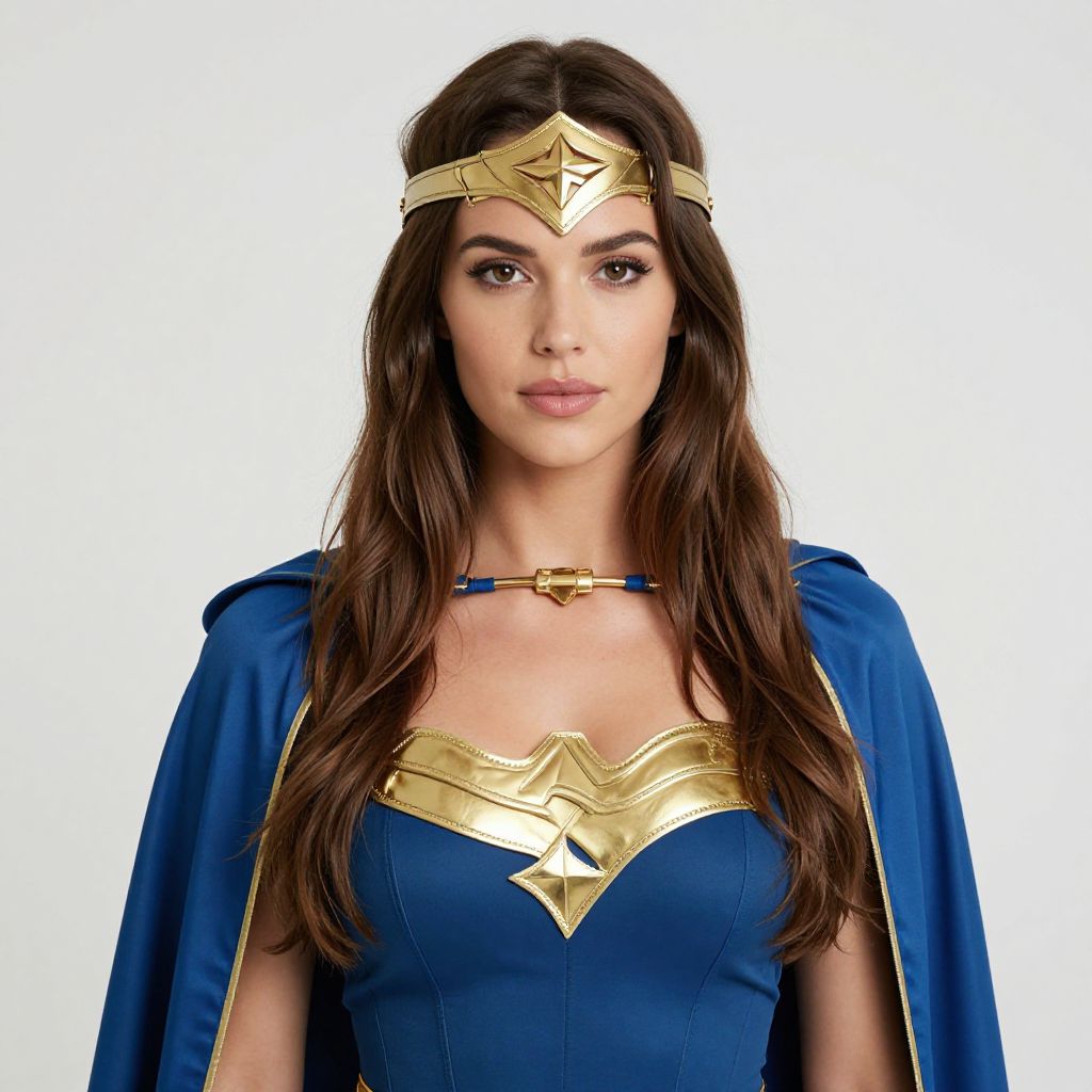A woman with long brown hair is wearing a red and gold superhero costume.
