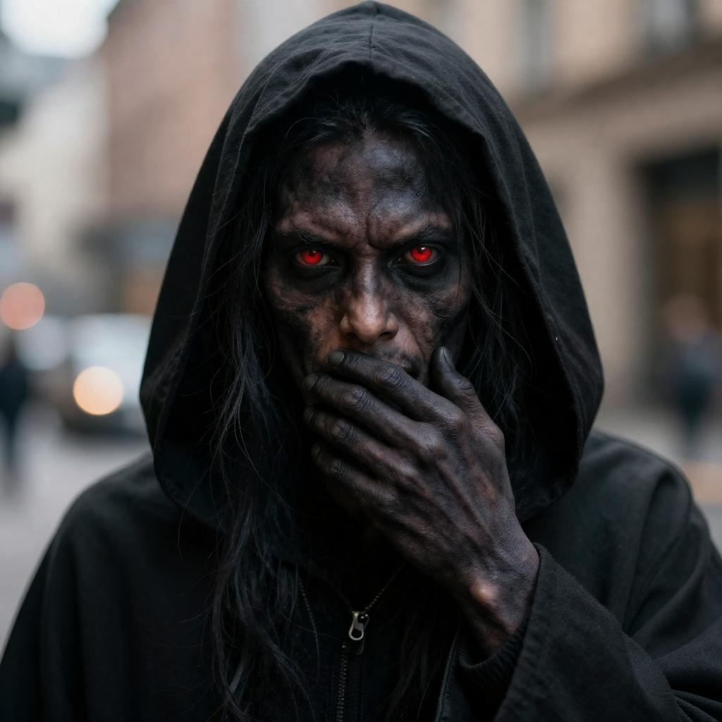 A humanoid creature with dark, ured skin, red glowing eyes, and long, messy hair covers its mouth with a grimy hand. It wears a black hooded cloak. Blurred urban background with soft, warm lighting. Close-up shot.