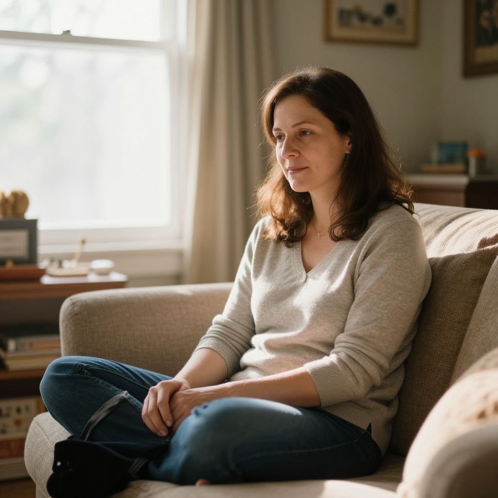 Portrait of a 900lb woman in a cozy home environment, warm colors and gentle light filtering through a window, highlighting expression of peace and self-acceptance, hyper-realistic with rich textures