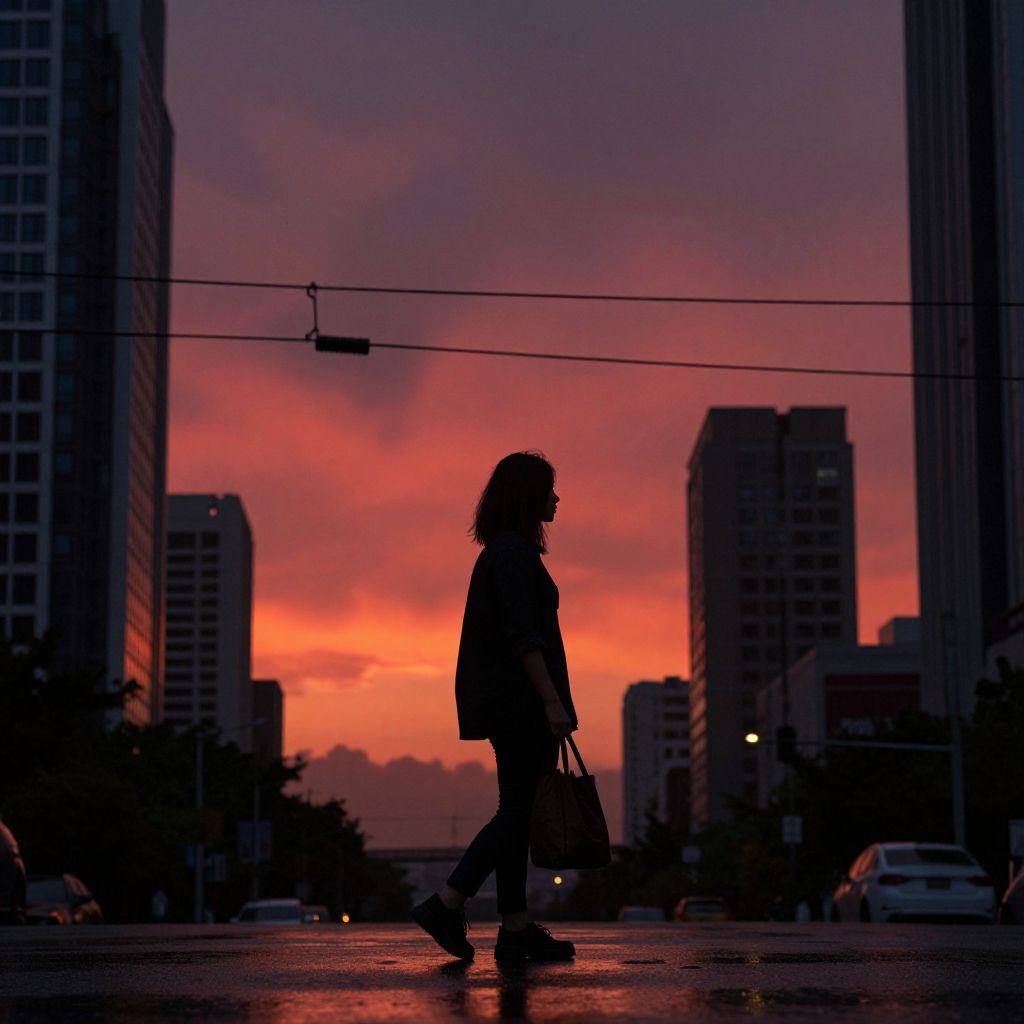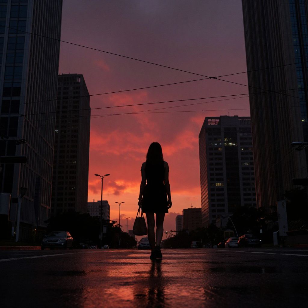 Mysterious woman stands silhouetted against a crimson sunset, clutching a bag as she walks through a rain-soaked urban landscape, framed by towering skyscrapers and electric wires under a brooding sky.