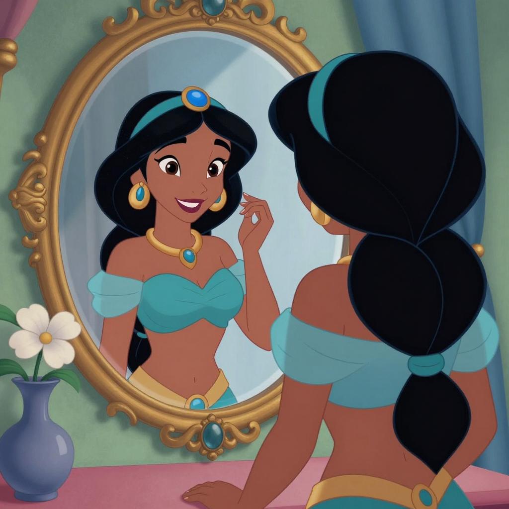 Digital illustration of Princess Jasmine from Aladdin. She has long black hair, brown skin, and wears a turquoise off-shoulder top, gold necklace, and headpiece with a blue gem. She stands in front of an ornate gold-framed mirror, smiling slightly, with one hand near her face. Her reflection shows her back, with a blue and black headband. A white flower in a blue vase is on the left. The background includes green and blue drapes. The visual style is reminiscent of traditional Disney animation. Two people, Jasmine and her reflection.