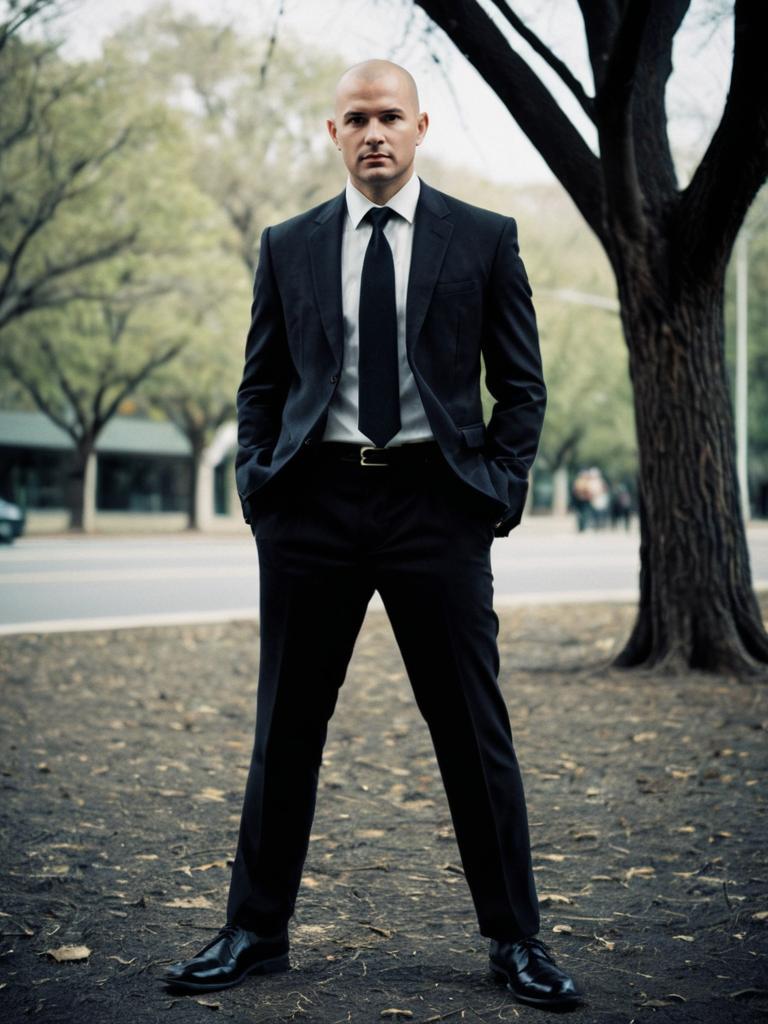 Full body portrait of a bald man wearing a black suit with a white collared shirt and black necktie. He is standing outdoors on a dirt ground with trees and a street in the blurry background. The man has a confident posture with hands in pockets, dressed formally with black pants and black leather shoes.