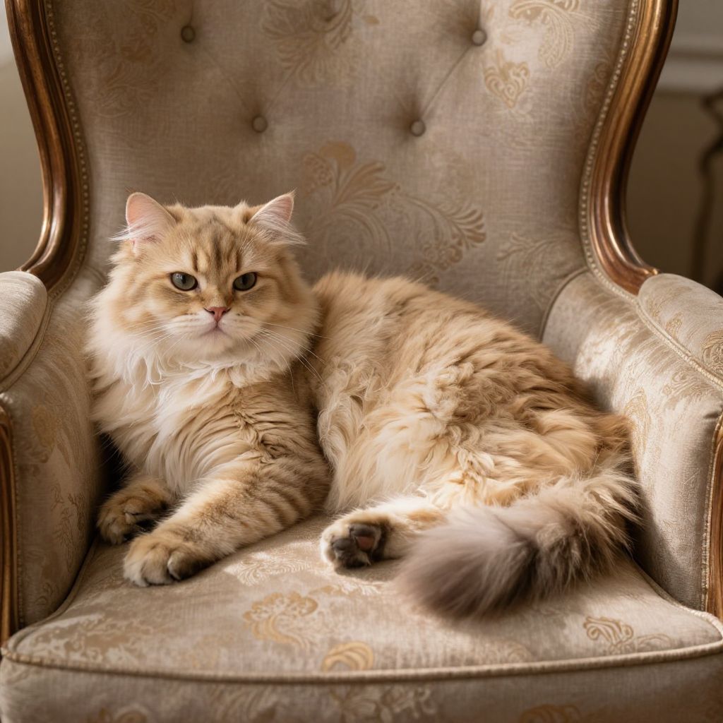 A fluffy blond cat lounging in a vintage armchair covered with elegant fabric, warm indoor lighting casting gentle shadows, intricate fur details and a relaxed posture conveying comfort and tranquility.