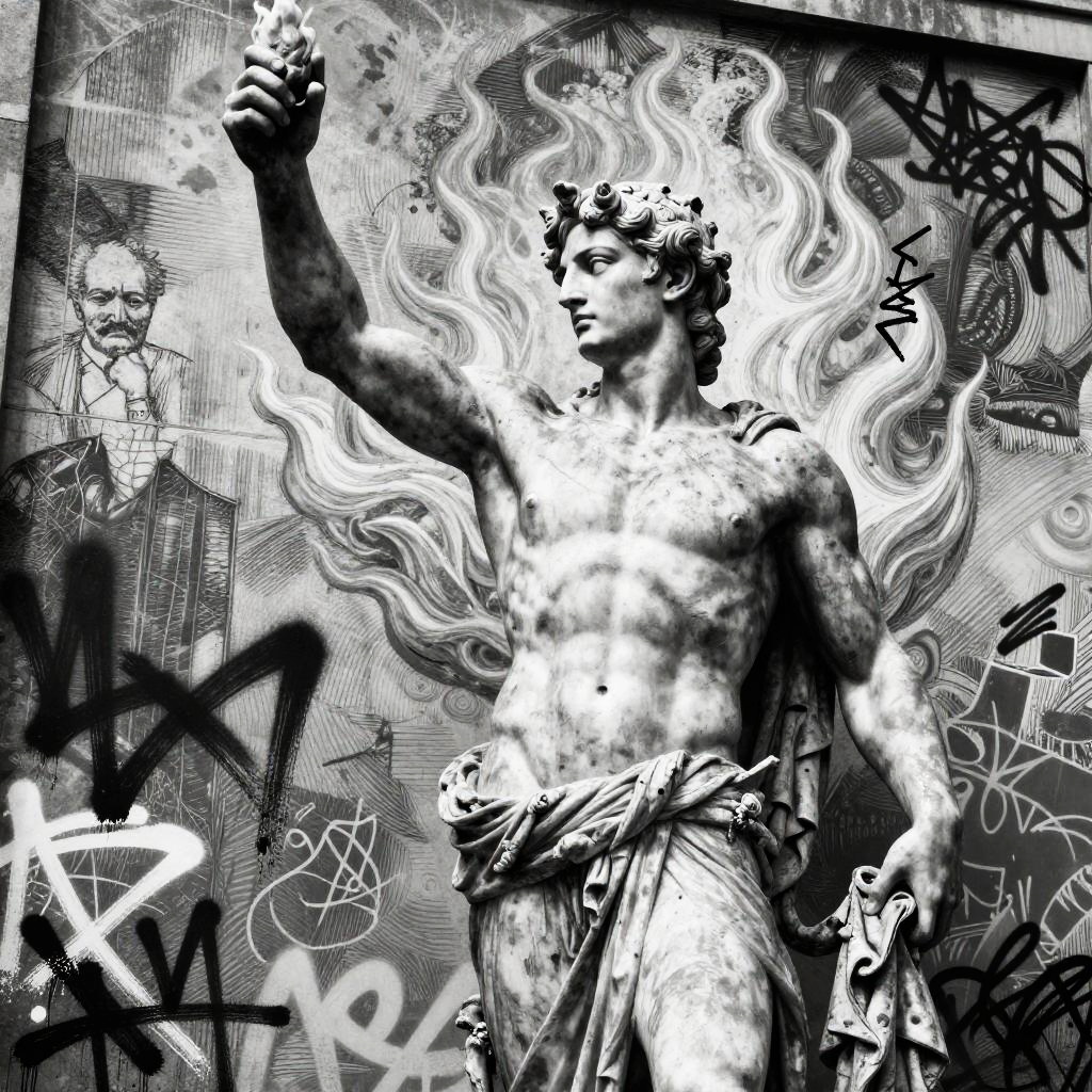 A black and white realistic photo of a classical statue depicting Prometheus holding fire, set against a detailed wall covered in graffiti and artistic sketches. The statue is muscular and draped with cloth, capturing intricate classical sculpture details, while the background features expressive lines and graffiti elements blending classical and street art styles.