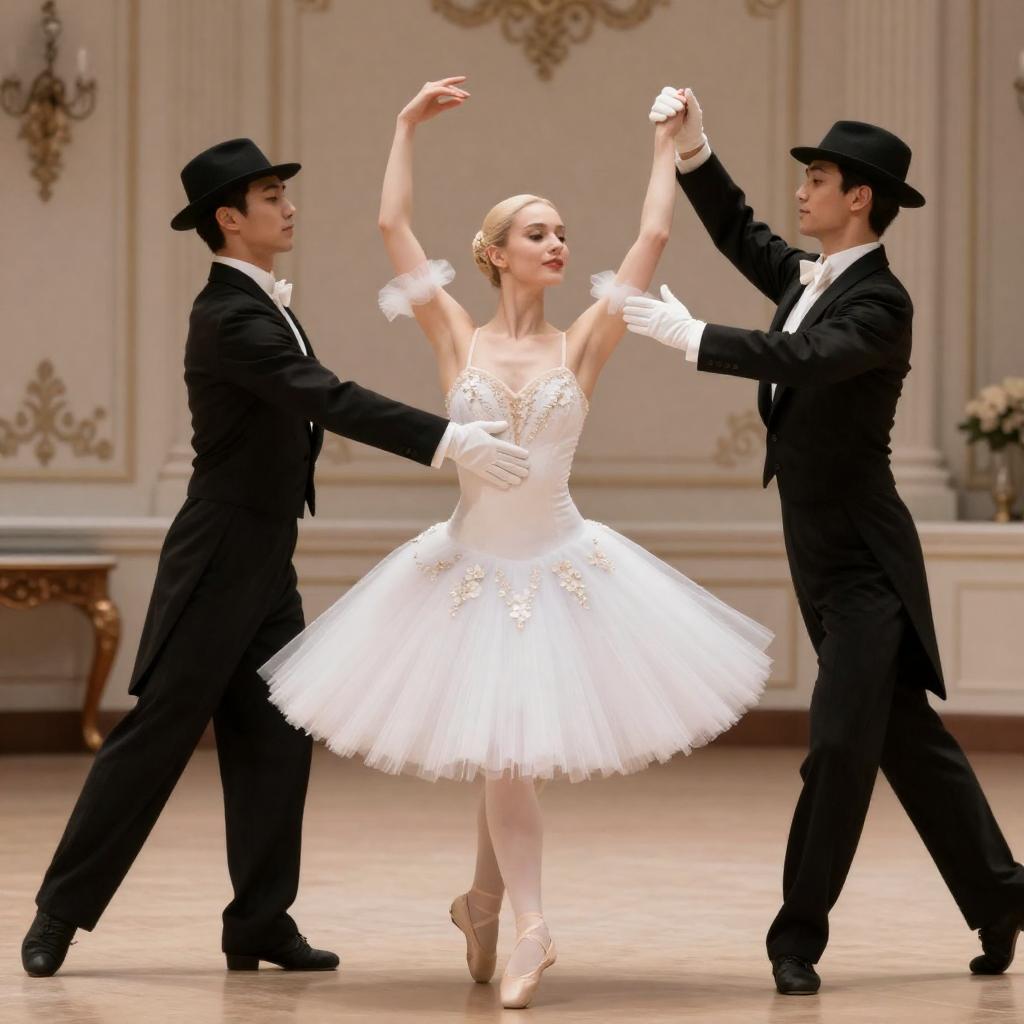 Photograph of a ballroom scene with a blonde woman in a sheer, white, floral-embellished tutu dress, holding her arms up. Two men in black suits, white gloves, and black hats dance around her. The background features ornate, classical decor.