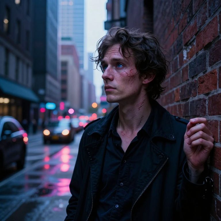 Photograph of a young, white, male with tousled brown hair and blue eyes, leaning against a wet, brick wall in an urban alley at dusk. He has visible scratches on his face and wears a black, slightly unbuttoned shirt and a dark jacket. The alley is reflective with rain, showcasing blurred, colorful city lights and parked cars in the background. His expression is pensive, with a slight frown. The overall color palette is cool with blue and purple hues, creating a moody, gritty atmosphere. The image has a cinematic, almost film-noir style.