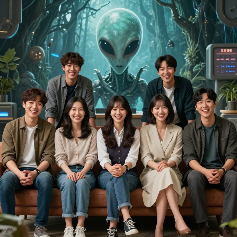 Intriguing seven sitting people, sci-fi novel writers, korean, smiling with lurking alien, documentary poster style, realistic, upbeat mood, 4k,
