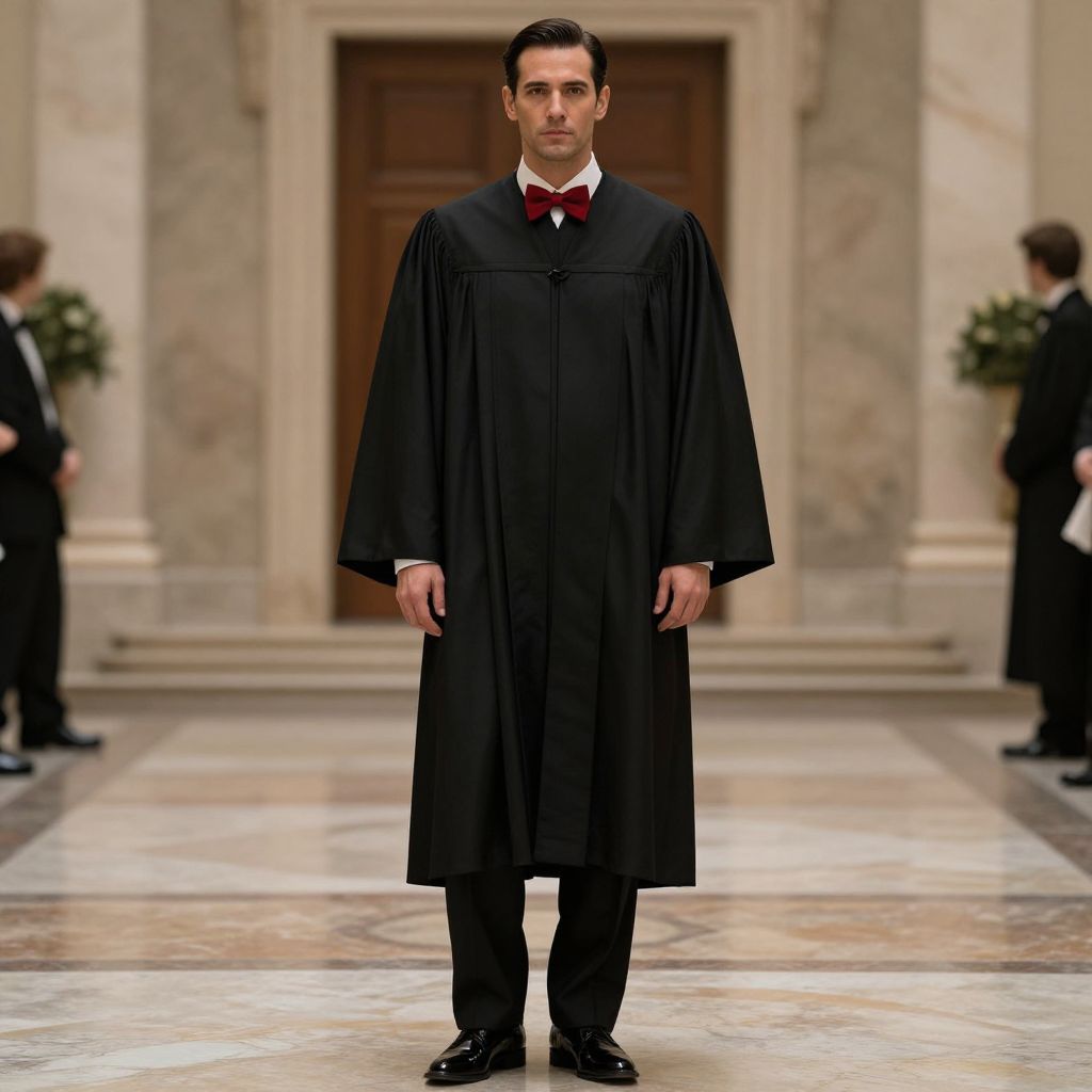 A confident and stylish man, with dark, neatly combed hair and a sharp jawline, wearing a black robe with a red bow tie and polished black shoes, exuding a sense of authority and elegance in a grand, formal setting.