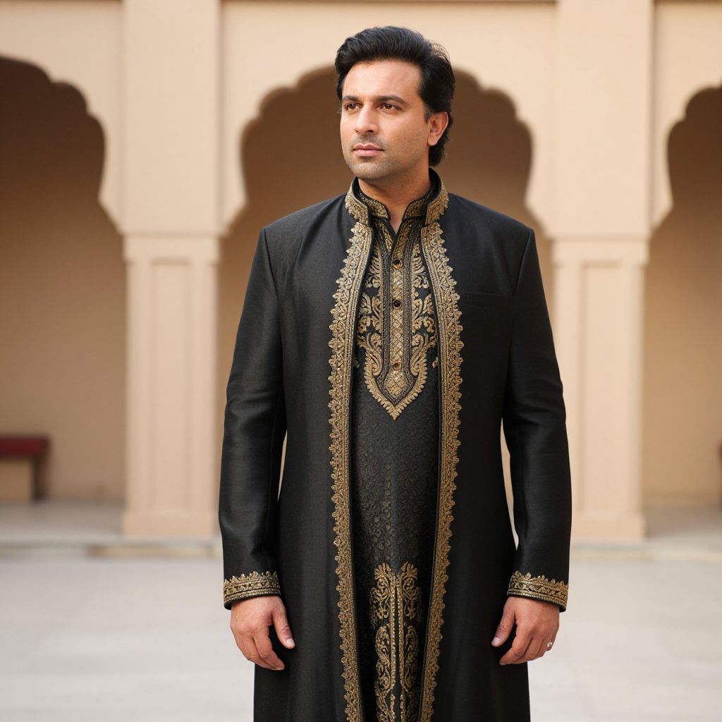 "Black Sherwani Man, a man in a black and gold sherwani with a black jacket"