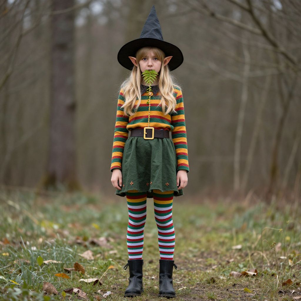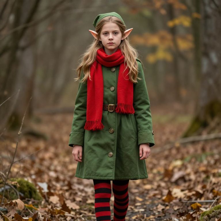 Female elf girl in green coat with red scarf and striped socks