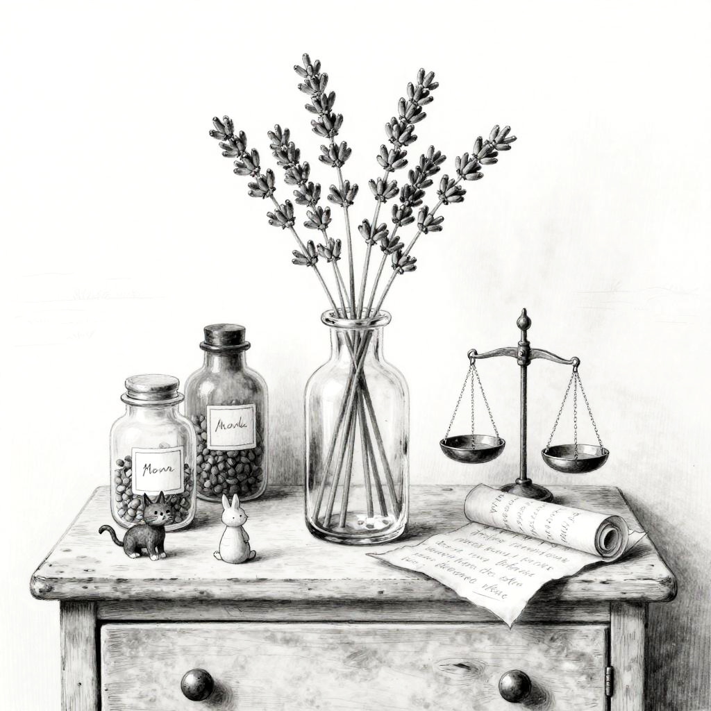 Black-and-white, whimsical hand-drawn still life on a vintage apothecary cabinet, centered on glass bottle with sprigs of dried lavender. Arranged around it: old medicine jars, rolled parchment, tiny scales. Tiny figurines of a cat and a rabbit add charm. Background is minimal, a few lines suggesting a wall and horizon. Soft shading, gentle crosshatching, delicate line art, balanced negative space, subtle paper grain, calm studio light, sketchbook aesthetic.