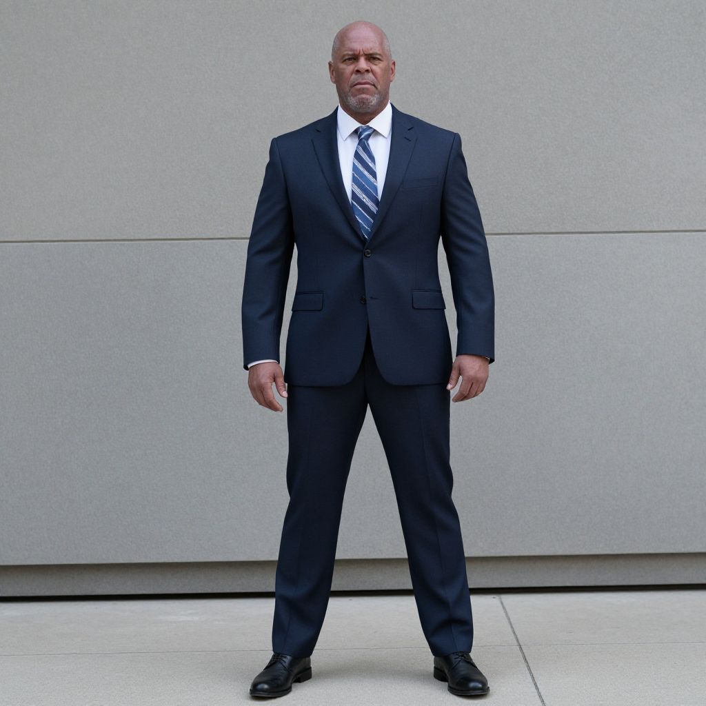 Photograph of a middle-aged bald white man standing confidently against a plain beige wall. He wears a dark navy blue suit with a white dress shirt and a diagonal-striped silver tie. His black leather shoes are polished. His expression is serious, with a slight squint in his blue eyes. The background is minimalistic, featuring smooth, light-colored walls and a clean, light-colored concrete floor. The man's physique is average, with a slight build. His arms rest naturally by his sides, and his stance is straight and composed. The lighting is even, highlighting the formal attire and professional demeanor.