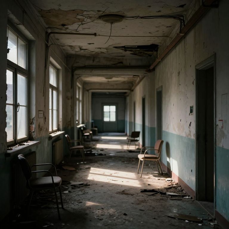 The image depicts a hyper-realistic, abandoned hospital interior bathed in a somber, atmospheric light. Sunlight streams through broken windows, casting a warm glow on the dusty floor, which is strewn with debris and scattered chairs. The ceiling, a network of exposed pipes and wires, is peeling and cracked, adding to the dilapidated ambiance. The walls, once pristine, now bear the marks of time and neglect, with peeling paint and exposed brick. The depth of the hallway is blurred, creating a sense of mystery and distance, while the foreground is sharply in focus, drawing the viewer's eye towards the light at the end of the corridor. The overall composition is a stark contrast between the bright, piercing light and the dark, decaying surroundings, evoking a sense of desolation and abandonment.