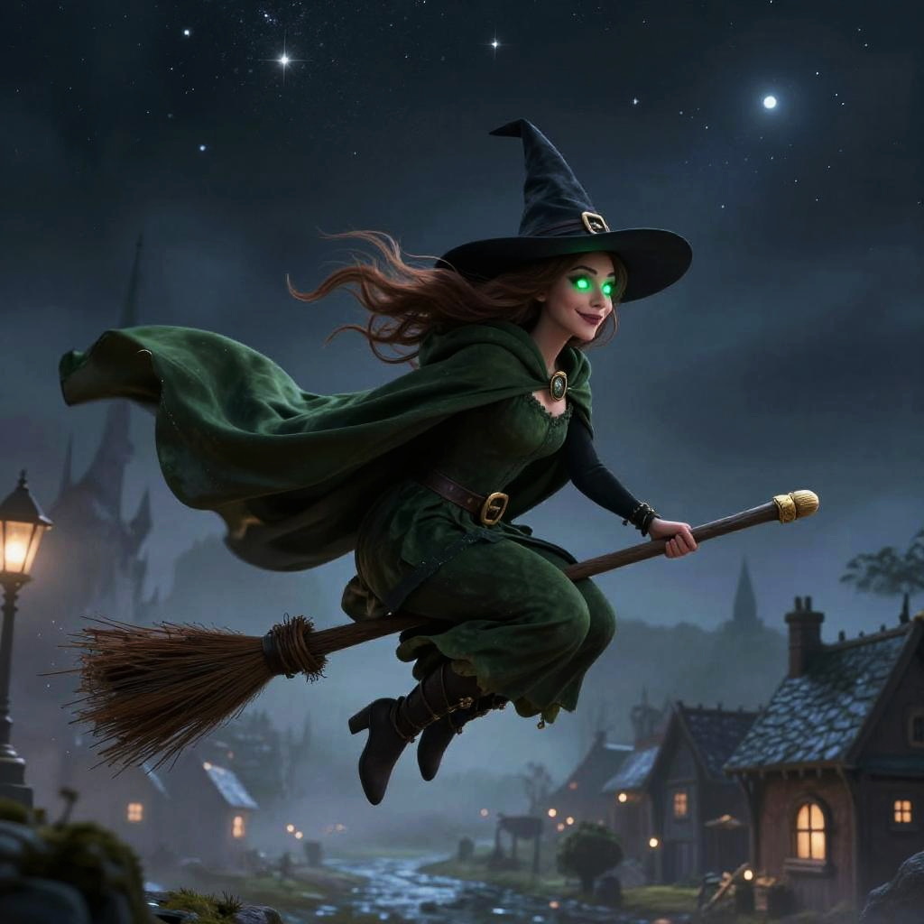 Curvy witch flying on a broomstick over a misty village at night, her hair flowing in the wind, dressed in a mysterious green cloak, with glowing eyes and a playful smirk under the starry sky
