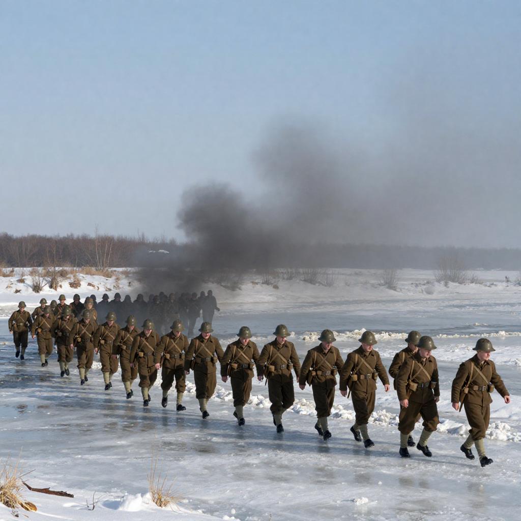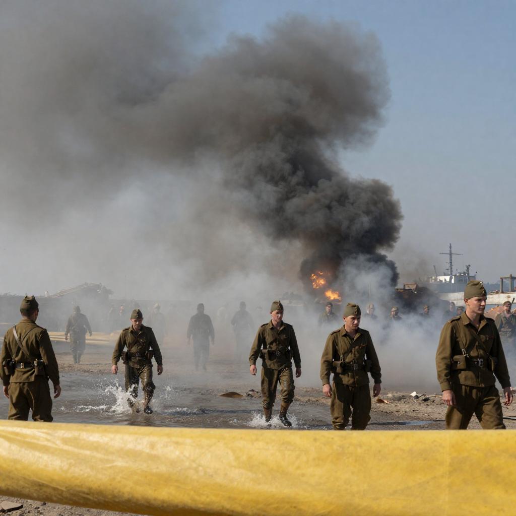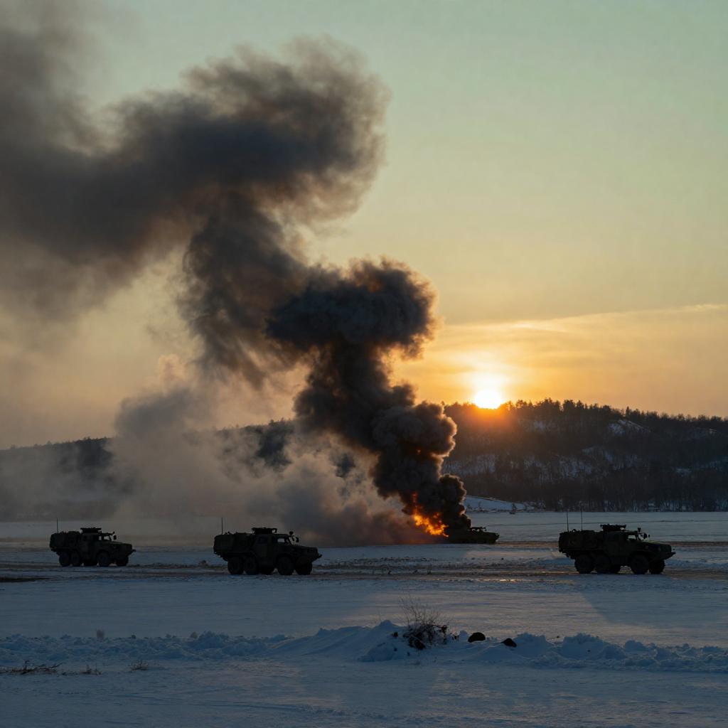 Photograph of a dramatic landscape at sunset. Explosions create large black smoke clouds on the left, while the sun sets behind a forested hill. Several military-style vehicles are scattered across a snowy field in the foreground, with waves crashing against the shore at the bottom. The sky is a gradient of yellow and green.
