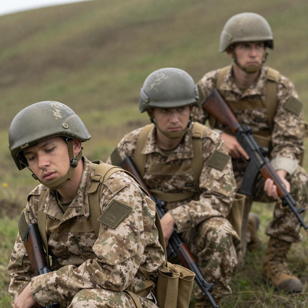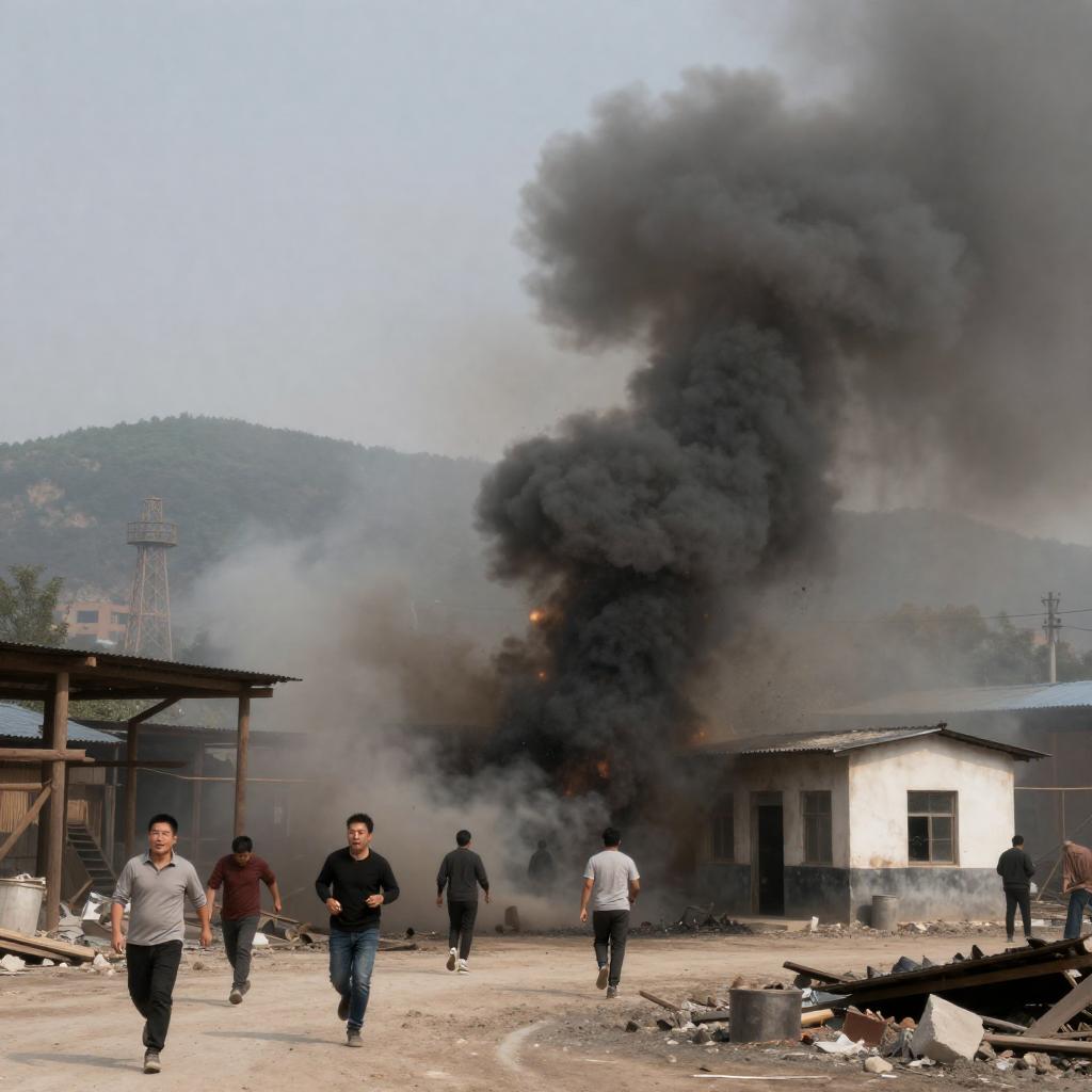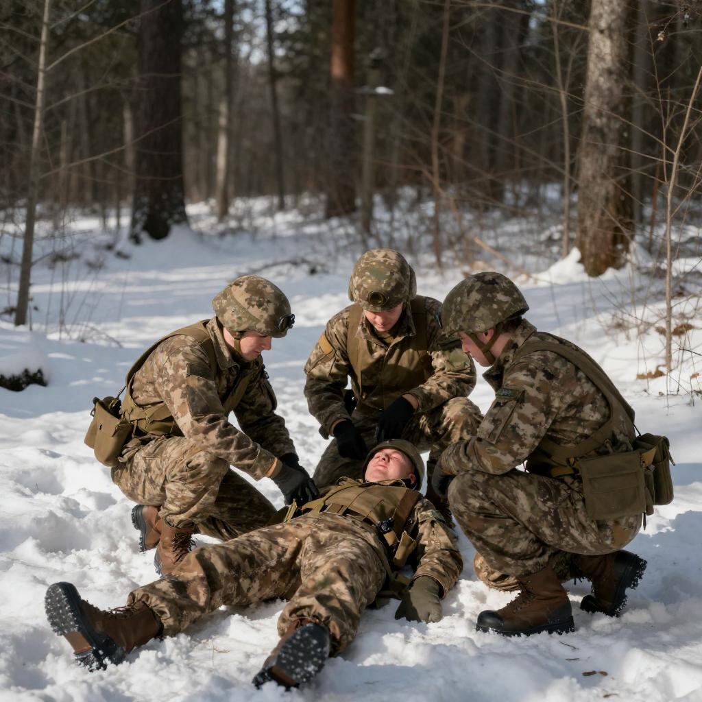 Photograph of a dramatic landscape at sunset. Explosions create large black smoke clouds on the left, while the sun sets behind a forested hill. Several military-style vehicles are scattered across a snowy field in the foreground, with waves crashing against the shore at the bottom. The sky is a gradient of yellow and green.