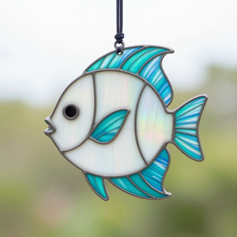 Stained glass fish pendant with white body and blue fins, hanging by black string, against blurred green and white background.