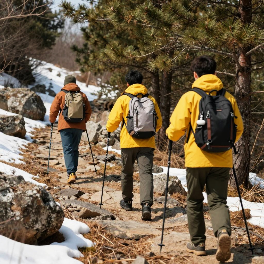Three friends hiking on a rocky trail in a forested mountain area with patches of snow, dressed in casual outdoor attire with backpacks and hiking poles, bright natural sunlight illuminating the scene, vibrant yellow jackets and warm clothing, surrounded by pine trees and rocks