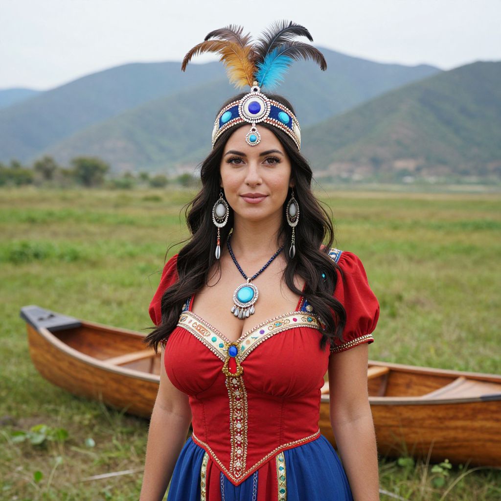 Photograph of a woman standing in a grassy field with mountains in the background. She has long dark hair, wears a red dress with gold and blue trim, and a blue and gold headpiece with a colorful feather. She has large silver earrings, a matching necklace with a blue gemstone, and a blue gemstone brooch on her forehead. A wooden canoe rests on the grass behind her. The sky is overcast, and the overall color palette includes vibrant reds, blues, and natural greens. The woman has a confident expression and an attractive, traditional Native American-inspired look.