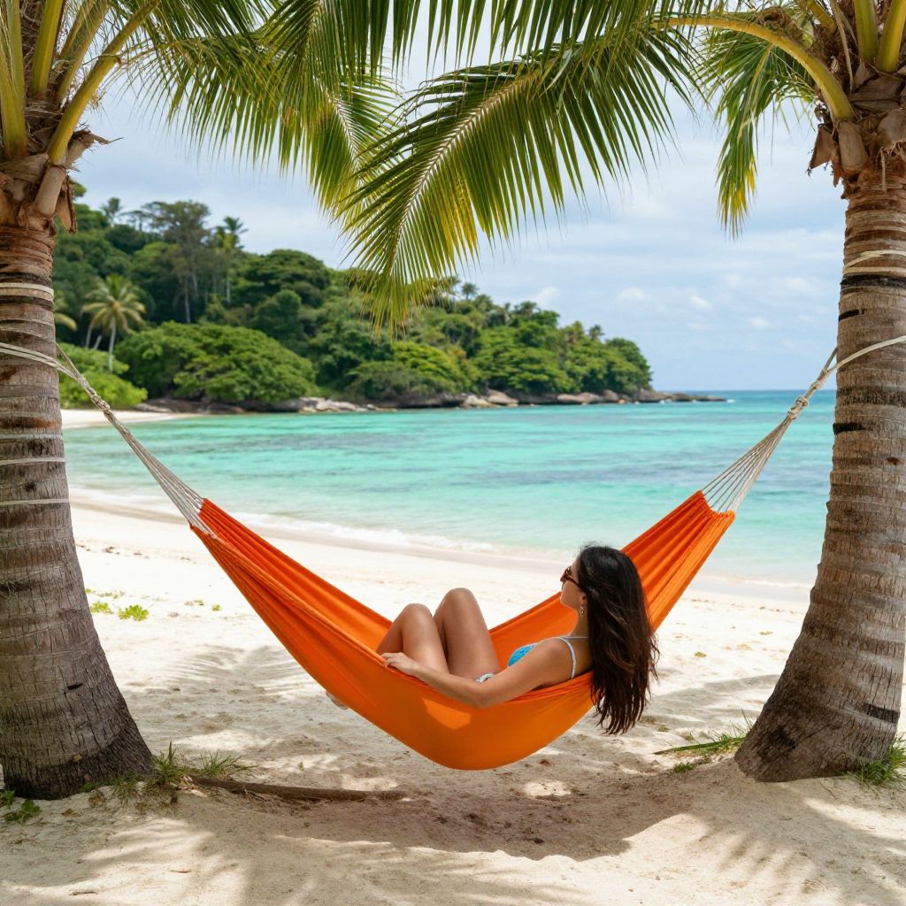 Young woman lounging in a vibrant orange hammock suspended between two palm trees, enjoying the serene beauty of a pristine tropical beach with turquoise waters and lush greenery in the background, embodying a tranquil escape in a Southeast Asian paradise.