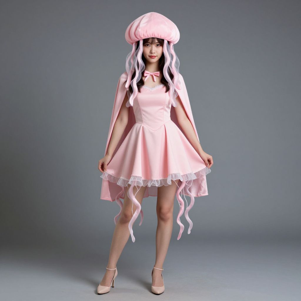 Jellyfish Costume Woman, woman in a pink dress and a pink cape