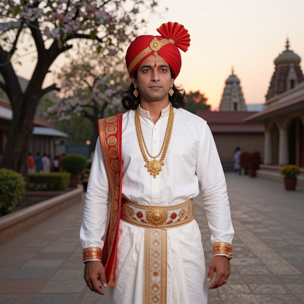 A realistic photographic portrait of a male adult wearing a detailed and authentic Krishna male full costume, including a white dhoti, red turban, golden jewelry, and a serene expression, set in a traditional Indian courtyard during sunset with a backdrop of flowering trees and a temple in the distance.