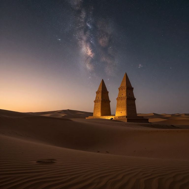 Serenity and solitude intertwine in this desert expanse, where ancient towers stand sentinel amidst undulating sands, their ethereal glow hinting at a timeless connection to the celestial sphere above, evoking a sense of quiet introspection and the enduring mystery of existence.