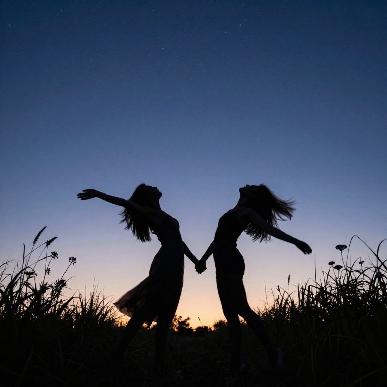 Two silhouetted figures joyfully dancing under a starry night sky, their flowing hair and outstretched arms forming dynamic shapes against the gradient horizon, surrounded by tall grasses and wildflowers.