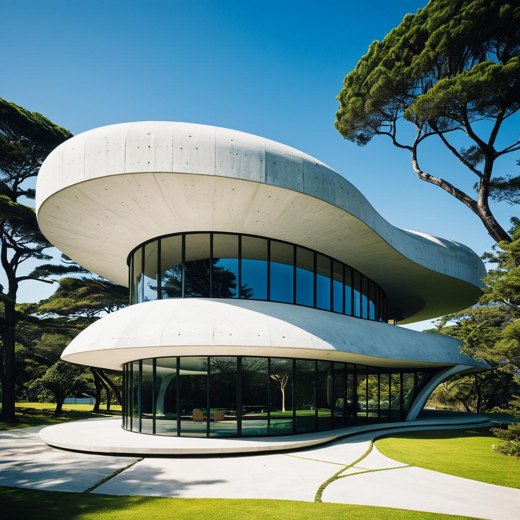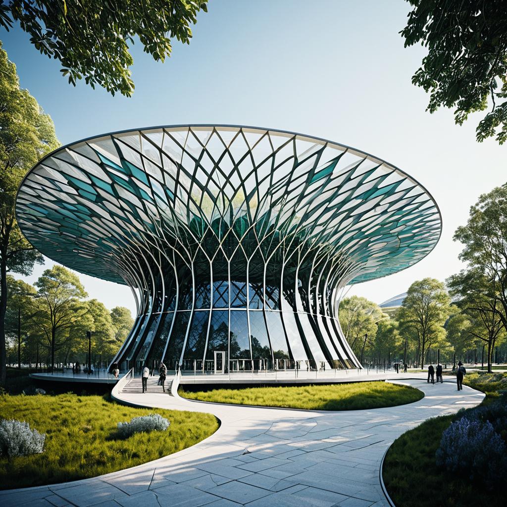Futuristic pavilion inspired by the style of Dominique Perrault, featuring mesh-like facades, reflective surfaces, seamless transparency, biomimetic architecture, vibrant and colorful ceramic textures, nature-inspired forms resembling tree canopies, ultra-detailed, harmonious integration with the landscape, high quality, imaginative and surreal, professional rendering, best quality