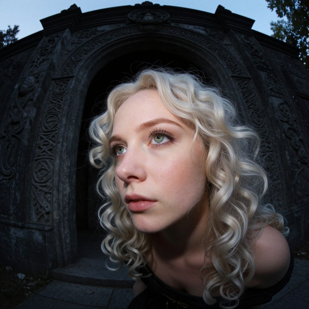 Craft a photorealistic portrait photograph showcasing an enigmatic Slavic woman with striking green eyes and platinum blonde curls. Illuminate her from the right side with soft twilight light, capturing her expression through a low-angle fish-eye lens perspective. Contrast her fair skin against the dark backdrop of a mysterious ancient stone archway adorned with intricate carvings that exude a supernatural aura. This evocative portrait combines ethereal beauty with an air of foreboding mystery.