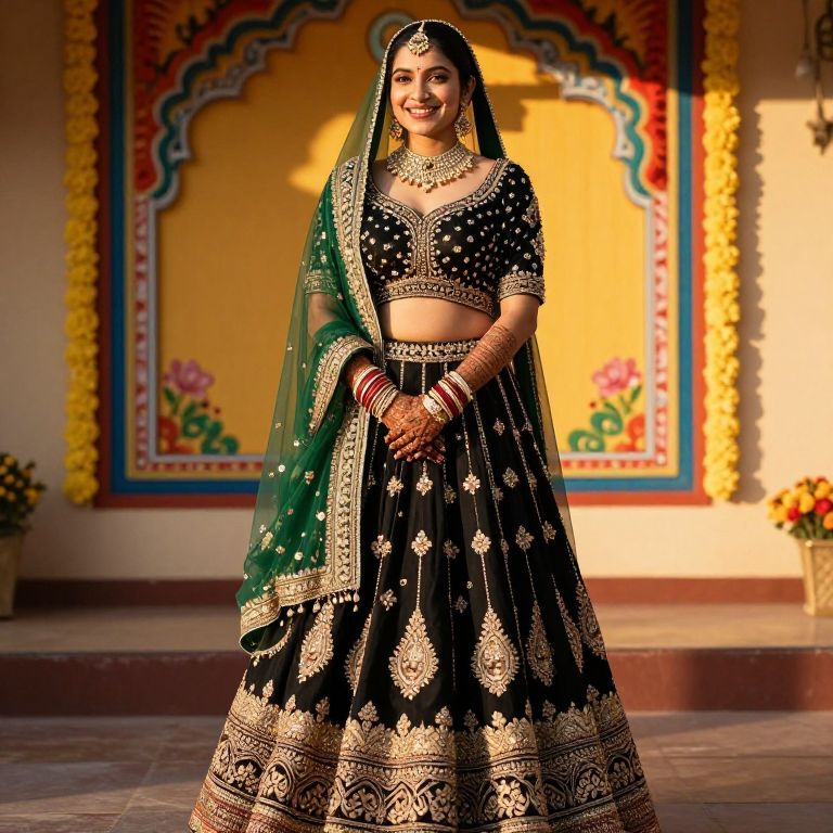 A radiant bride with a radiant smile and a fair complexion dressed in a stunning black banarasi lehenga, the deep emerald green border on the lehenga catching the golden afternoon sunlight, standing in front of a colorful henna decoration wall in a traditional bridal setup, natural lighting, realistic portrait style.