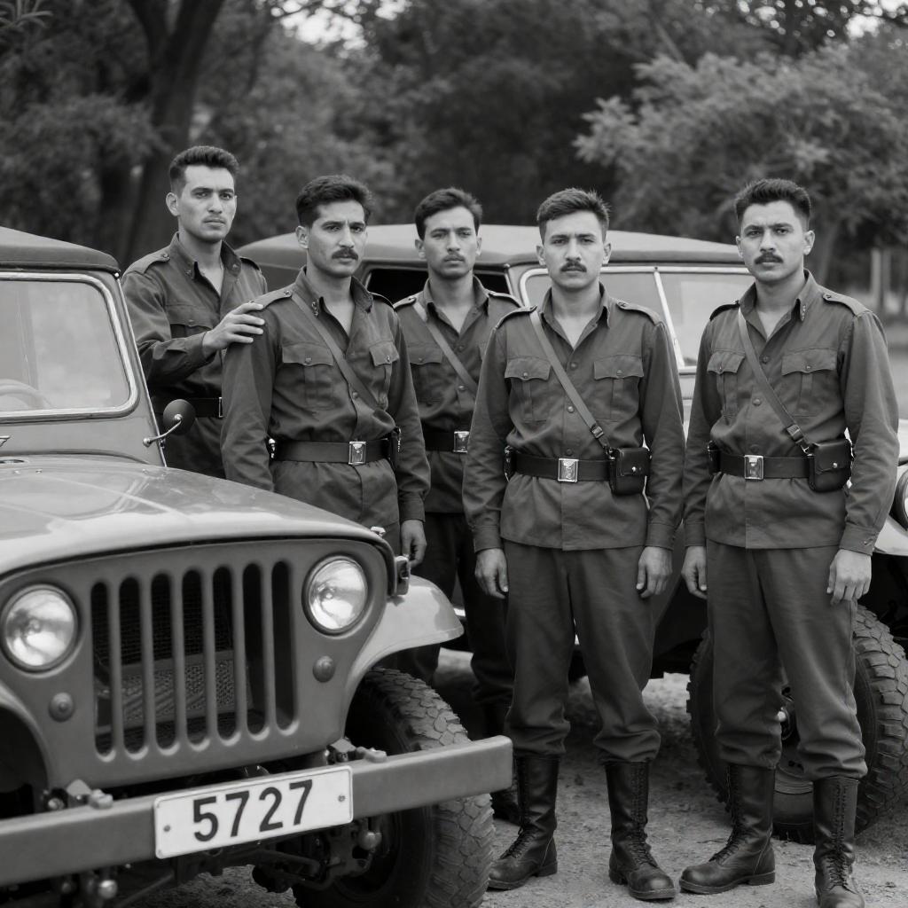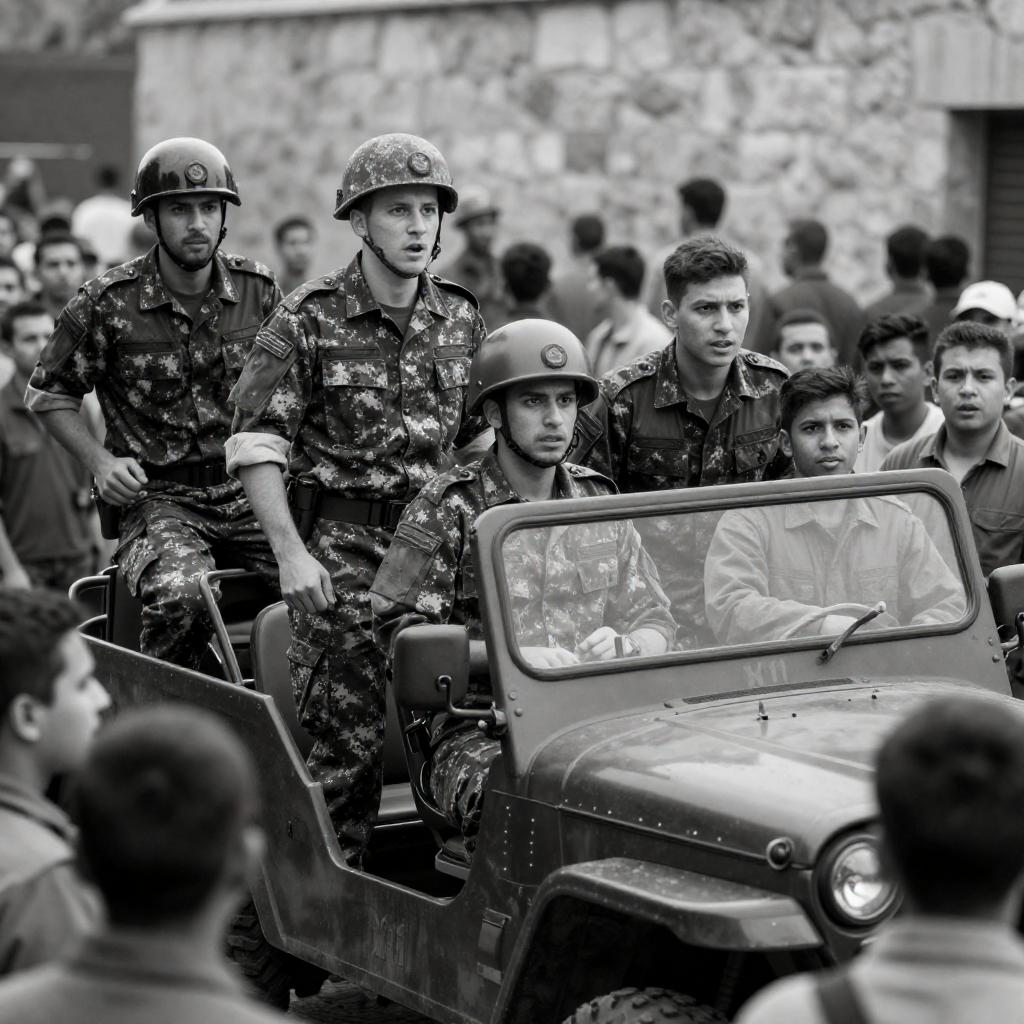 Black and white photograph of a chaotic scene. Soldiers in camouflage uniforms stand in an open-top jeep, surrounded by a crowd of people. Stone wall in the background. Intense facial expressions. Multiple people, soldiers and crowd, in close proximity. Jeep has "X11" on the side.