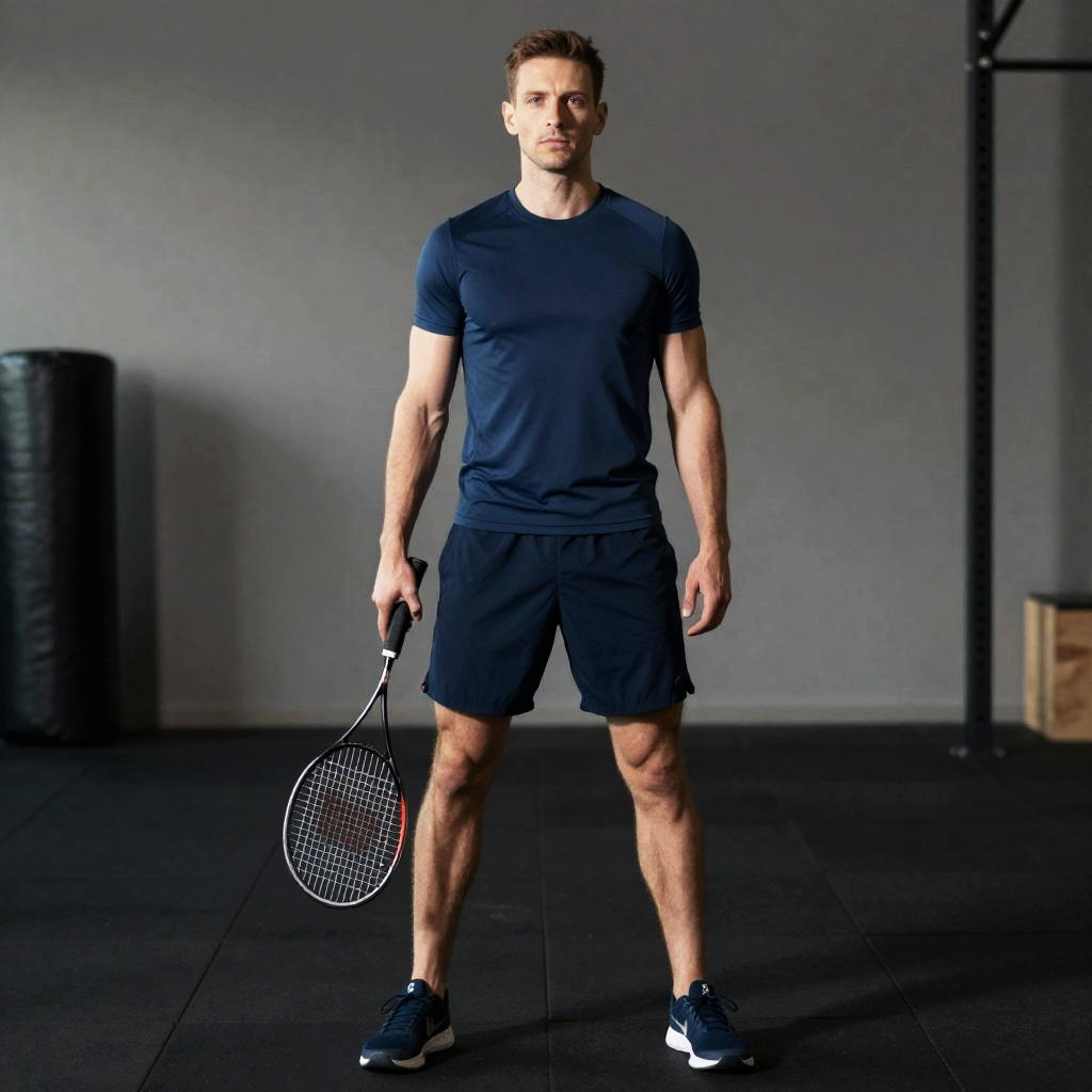 Athletic man wearing a navy blue sleeveless shirt and matching shorts walking indoors in a gym setting, holding a red tennis racket in one hand and a yellow tennis ball in the other. He is wearing white athletic shoes with a neutral grey background.