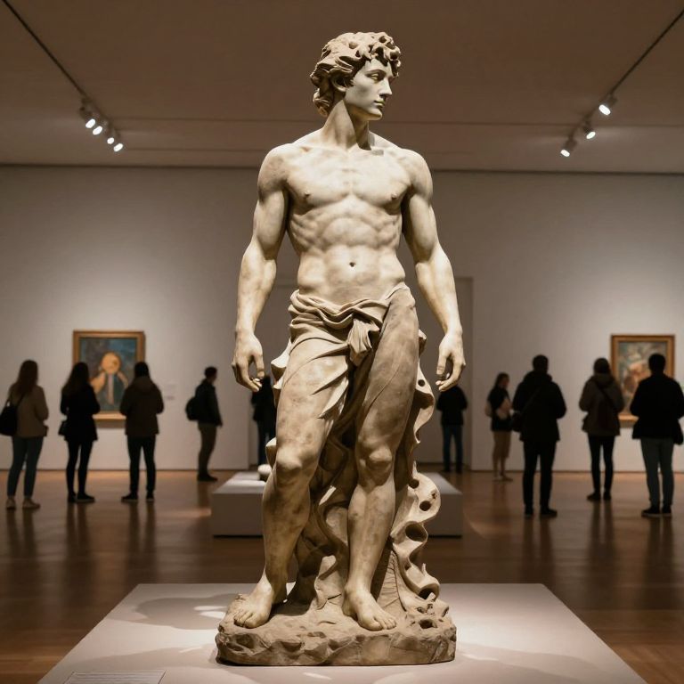 Photograph of a classical marble statue of a muscular, nude male figure standing in an art museum. The statue, with detailed musculature and a draped cloth around his waist and one leg, features a contemplative expression. In the background, several silhouetted visitors stand in front of framed paintings on a white wall, under soft, focused lighting. The dark wooden floor contrasts with the light-colored statue and wall. The museum setting is modern, with spotlights illuminating the statue prominently.
