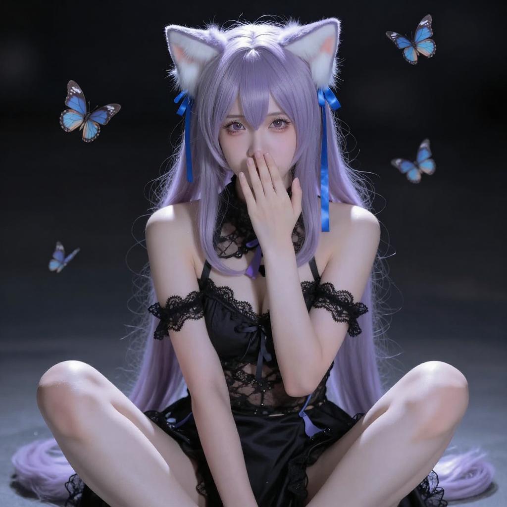 CGI image of a nude, purple-haired anime girl with cat ears, wearing a white, open-collared top and white thigh strap. She stands against a dark, brick-walled background, arms raised, holding a glowing, white, cylindrical object. Her skin is fair, and her expression is playful. Bright, neon lighting highlights her figure.