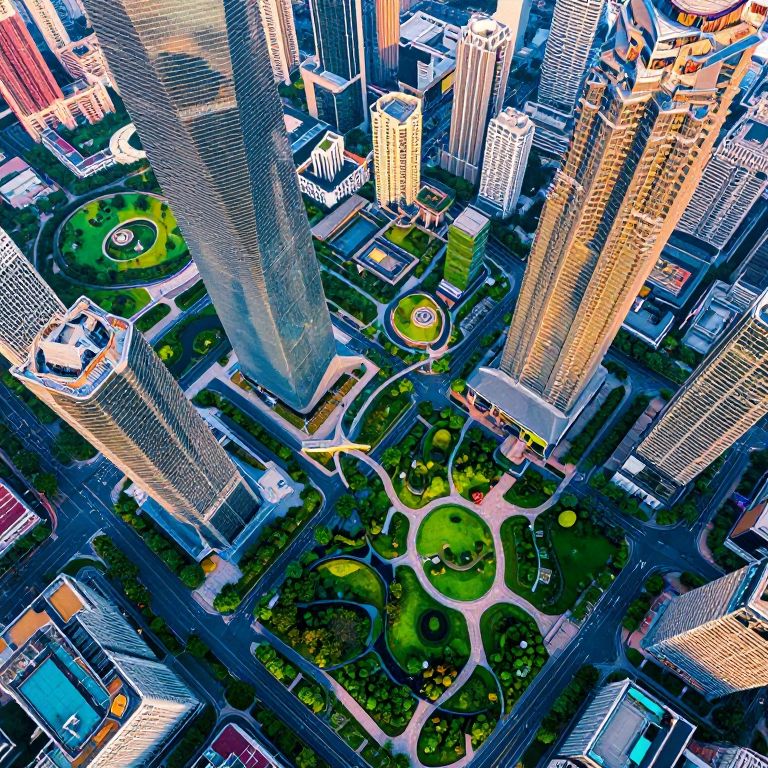 The image presents a vibrant, futuristic cityscape viewed from an orbital perspective. The city is a harmonious blend of organic and technological elements, with intricate details and a vivid color palette. Tall, sleek skyscrapers tower over the landscape, their glass facades reflecting the bright, neon hues of the surrounding environment. Interspersed among the high-rises are lush green spaces, including large circular parks and winding pathways, creating a sense of balance and tranquility. The city's layout is grid-like, with roads and pathways forming a network that connects various districts. The overall composition is dynamic, with elements such as the skyscrapers, parks, and roads interacting in a complex yet cohesive manner. The interplay of colors, from the cool blues and greens of the vegetation to the warm yellows and reds of the buildings, adds to the image's visual richness and depth. The scene is a testament to the beauty of urban design, where nature and technology coexist in harmony.