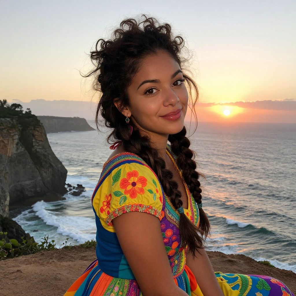 A vibrant female with a messy yet stylish textured hairstyle, combining tousled curls and loose braids, dressed in a colorful fantasy costume with bright colors and floral embroidery, sitting on a cliff overlooking a sunset with waves crashing below, her face has warm olive skin, bright eyes, and a joyful, relaxed expression, natural daylight, hyperrealistic photography
