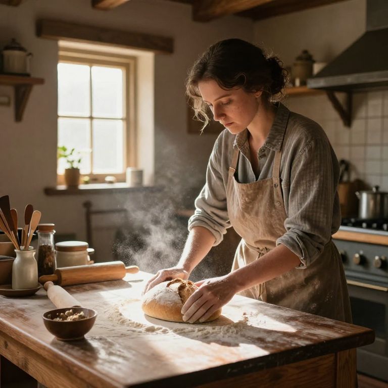 Fanny in a cozy, rustic kitchen baking bread, warm tones, wooden furniture, late afternoon light pouring through a small window, flour dust in the air, nostalgic and heartwarming scene, detailed textures, homely atmosphere