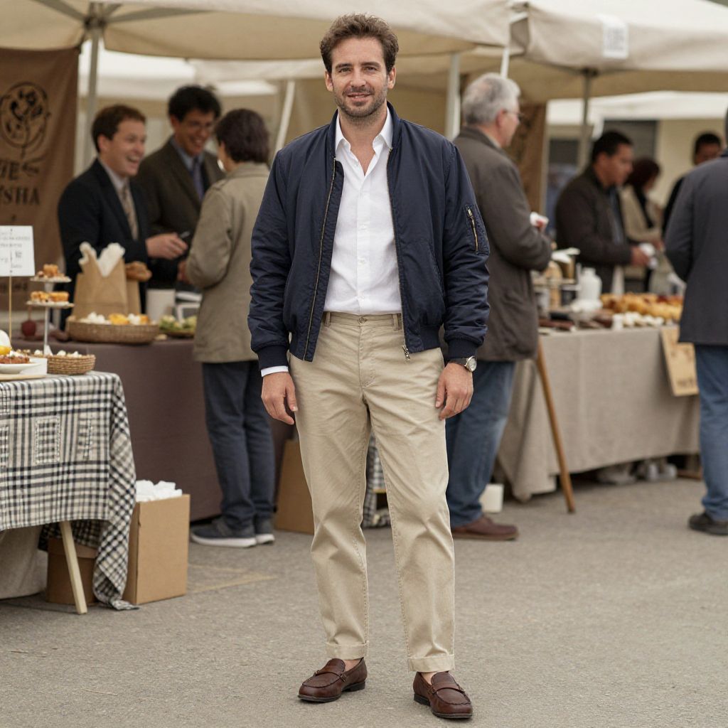 A man, navy velvet sports jacket, crisp white dress shirt, light beige khakis, brown leather loafers, silk pocket square, rustic stone walls, colorful tapestries hanging, intimate stage for performances, hand-tinted photograph, confident smile. Man has masculine face and piercing eyes