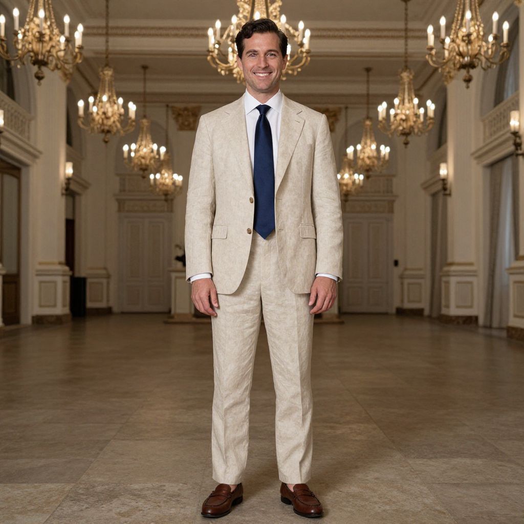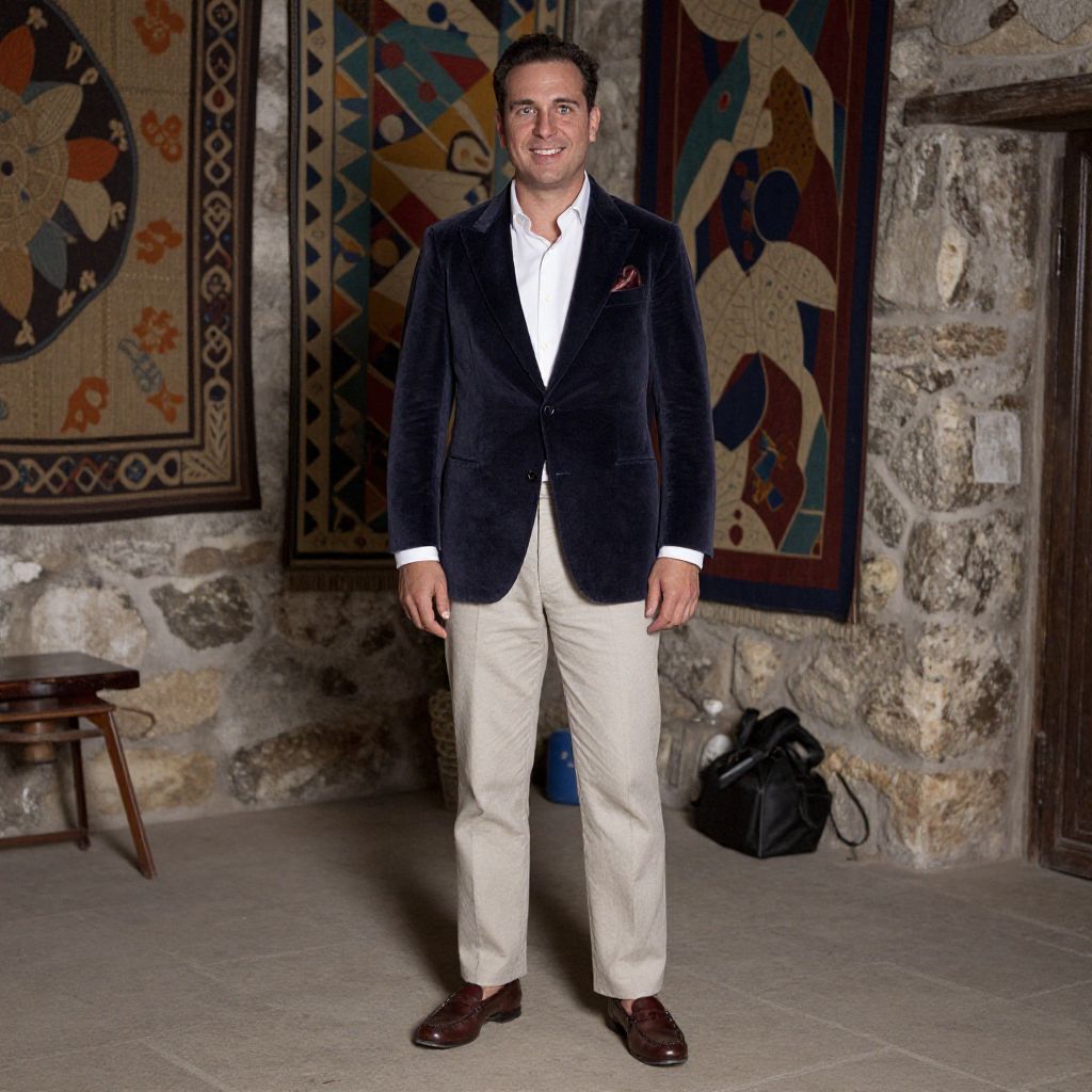 Photograph of a smiling man in a black velvet blazer, white shirt, beige pants, and brown shoes, standing in a stone-walled room