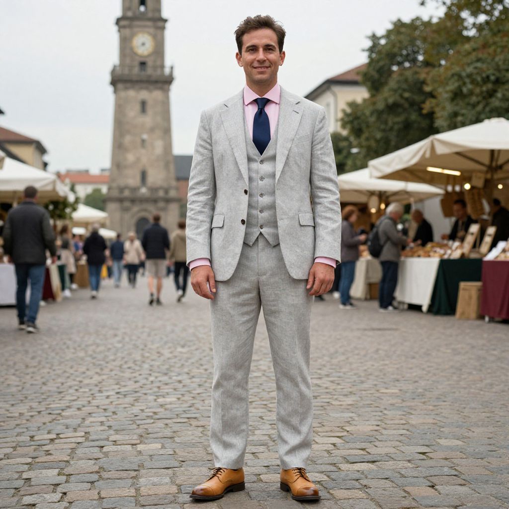Photograph of a smiling man standing in a rustic, stone-walled room. He has short, dark hair and is wearing a black velvet blazer, white dress shirt, beige trousers, and brown leather shoes. The background features colorful, geometric-patterned tapestries with abstract human figures. A wooden stool is on the left, and a black bag is on the floor to the right. The stone walls have a textured, weathered appearance, adding a historical or medieval ambiance to the setting. The man's attire is formal yet stylish, contrasting with the rustic background.