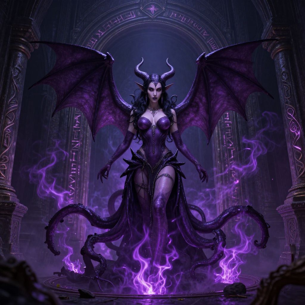 Digital artwork of a dark, demonic queen with purple wings, horns, and tentacles, surrounded by glowing purple flames in a gothic temple.