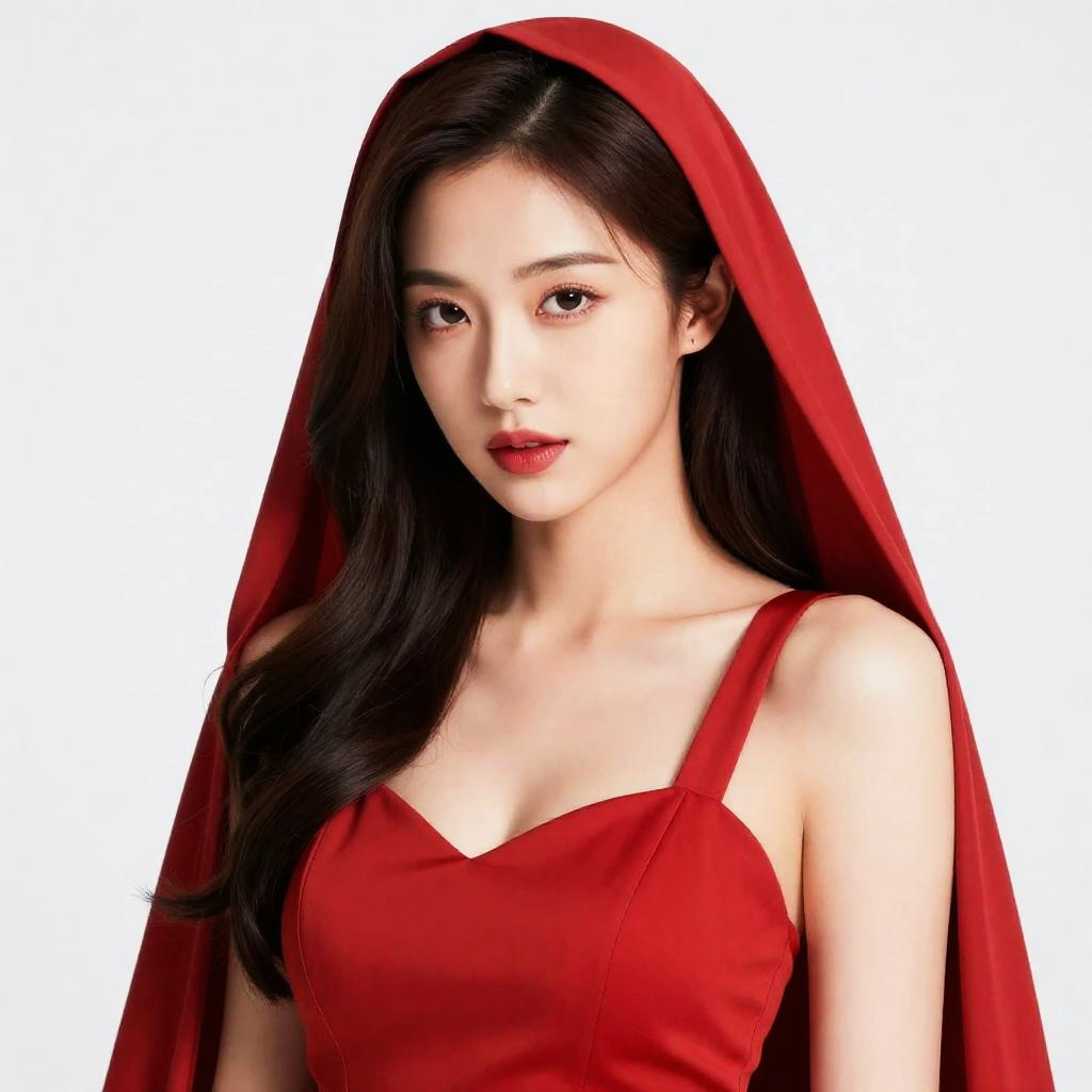 Close-up portrait of an Asian woman wearing a red goddess costume with a matching red cape draped over her head. She has long dark hair, subtle makeup with red lipstick, and is posing against a plain white background.