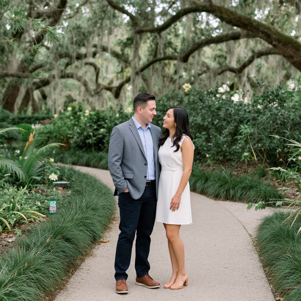 Photograph of a young couple standing on a concrete path in a lush, green garden. The man, with short dark hair, wears a gray blazer, blue shirt, black pants, and brown shoes. He gazes at the woman with a gentle smile. The woman, with long black hair, wears a sleeveless white dress and beige flats. She looks up at the man with a slight smile. The background features dense greenery, including ferns and large, draped Spanish moss on the trees. The path is flanked by tall, grassy plants. The image has a bright, natural light.