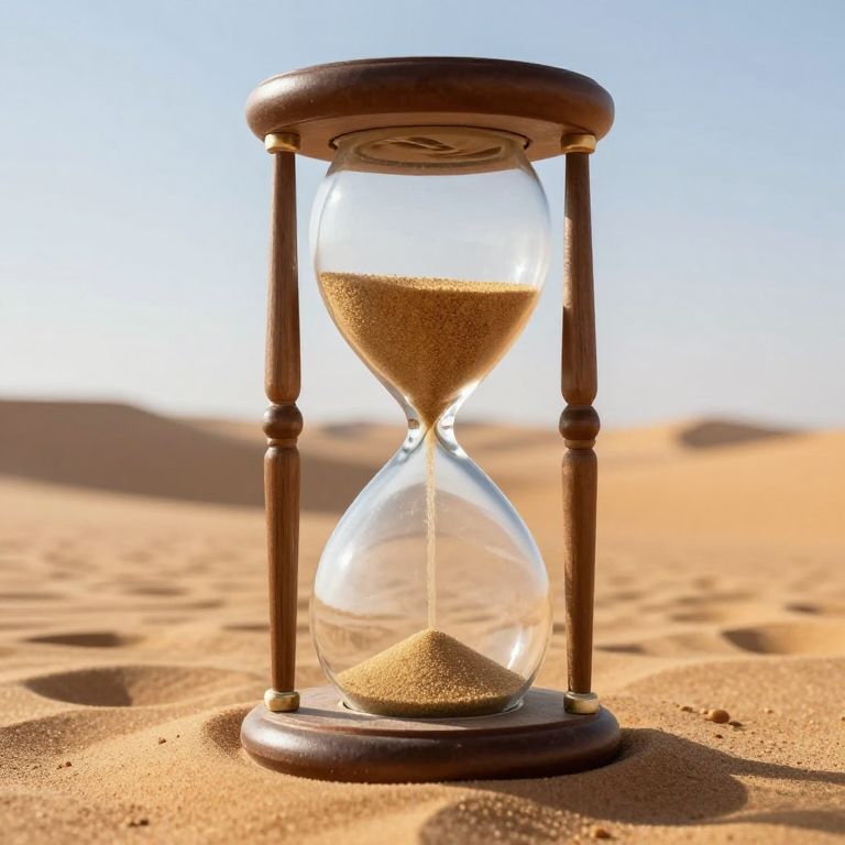 Photograph of a wooden hourglass with golden sand, standing on a sunlit desert, casting shadows on the sandy ground.