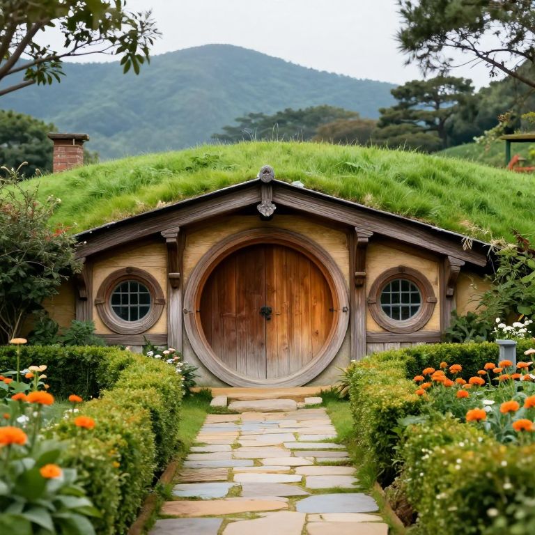 Charming Hobbiton-style house with a vibrant green grassy roof, featuring a round wooden door flanked by two circular windows, surrounded by neatly trimmed hedges and colorful orange flowers, leading to a stone-paved pathway through a lush garden under a serene mountain backdrop.