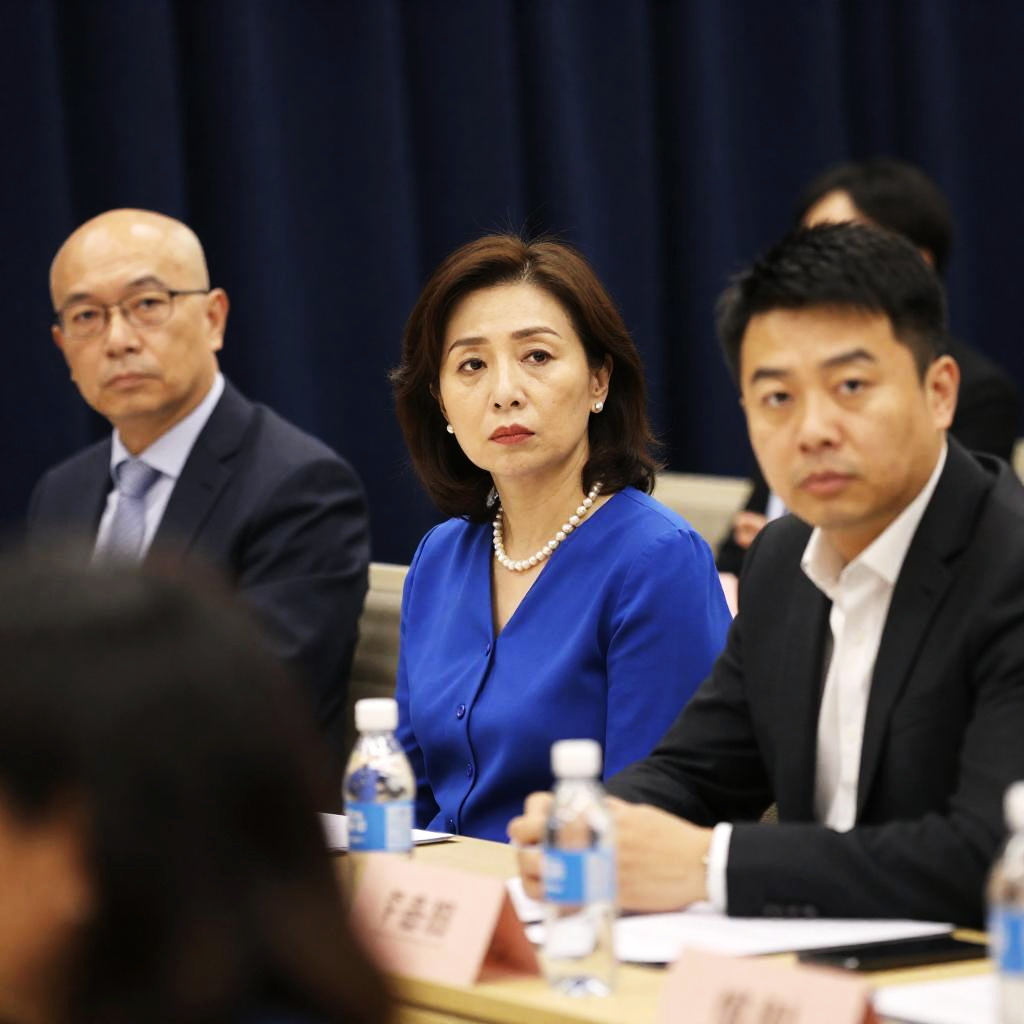 A group of five middle-aged Asian men dressed in dark suits and blue ties seated at a table with a red curtain backdrop. The central man with gray hair and glasses is focused on writing in a notebook. One man holds a red and white pen, looking down. Two clear glass bottles are placed on the table.