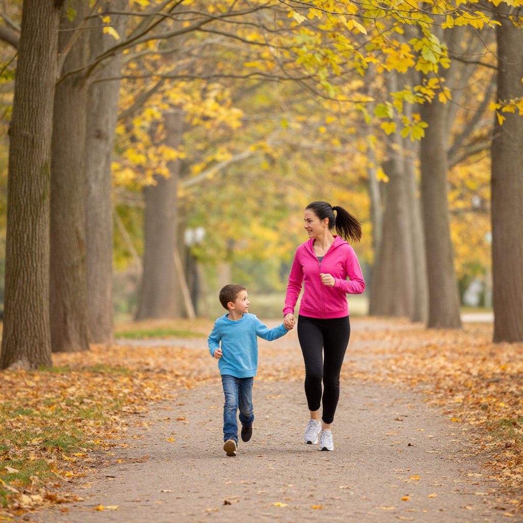 Woman and child jogging hand-in-hand along a scenic park path lined with golden autumn leaves and towering trees.