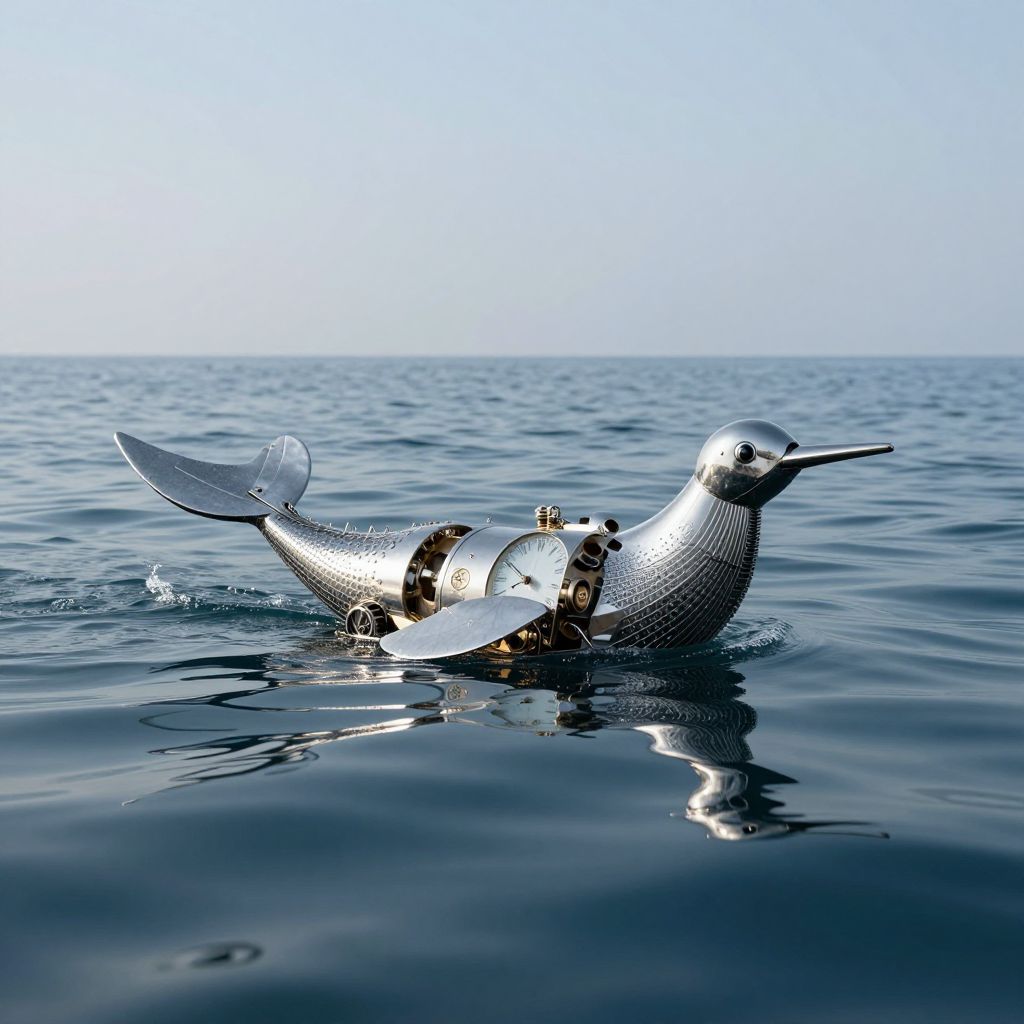 A clockwork whale drifts serenely across the mirrored surface of the ocean, its metallic form whispering the echoes of human longing and the timeless dance between creation and memory.
